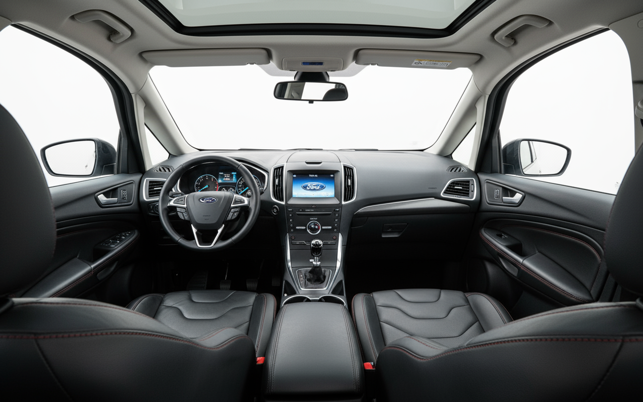 Оснащенный технологиями своего времени, этот S-MAX интегрирует системы, которые облегчают жизнь на борту и повышают безопасность. Информационно-развлекательная система, вероятно, Ford SYNC, становится центром управления навигацией и связью. Системы помощи водителю и такие элементы, как система Stop & Start, демонстрируют его ориентацию на эффективность и современный комфорт, хотя и без показной роскоши современных гигантских экранов.