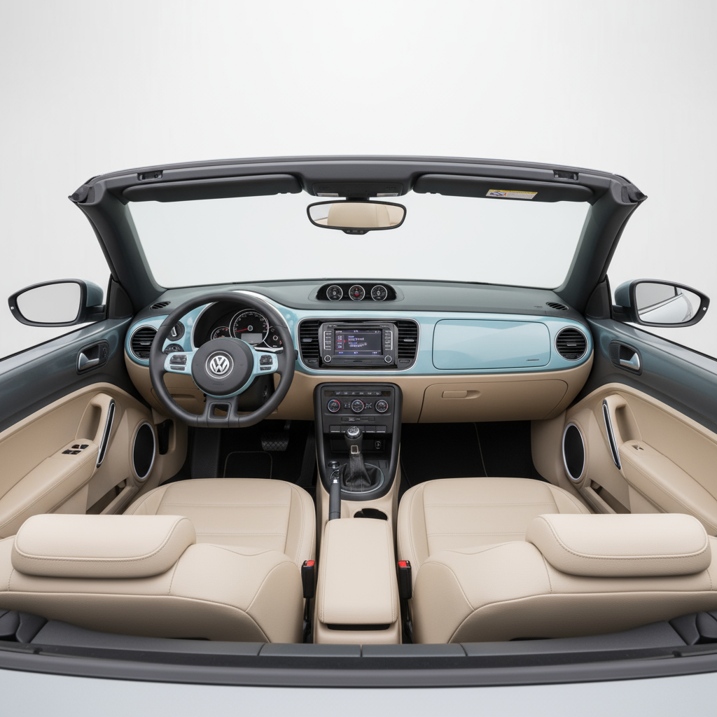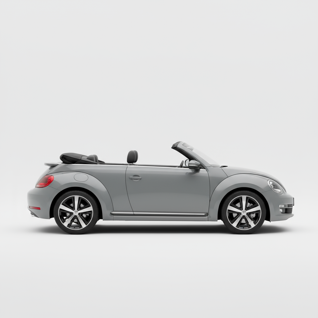 Дизайн Volkswagen Beetle Cabrio R-Line — это современная и спортивная переинтерпретация культового «Жука». Его плавные и округлые линии дополняются характерными элементами пакета R-Line, которые придают ему более агрессивный и динамичный вид. Тканевый мягкий верх, который элегантно складывается, сохраняет классический силуэт Beetle, а такие детали, как 18-дюймовые колеса и специальные бамперы R-Line, подчеркивают его спортивный характер. Интерьер, сохраняя свою ретро-сущность, включает современные штрихи и хорошее качество отделки, создавая уютную и функциональную обстановку.